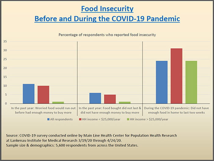 During the first month of the U.S. coronavirus lockdown,about a quarter of people surveyed said they did not have enough food in their homes to last two weeks, according to the results of a COVID-19 consumer poll distributed by the Main Line Health Center for Population Health Research (CPHR) at the Lankenau Institute for Medical Research.
